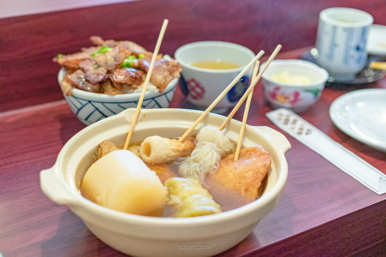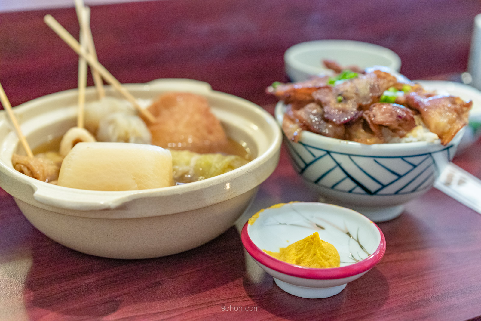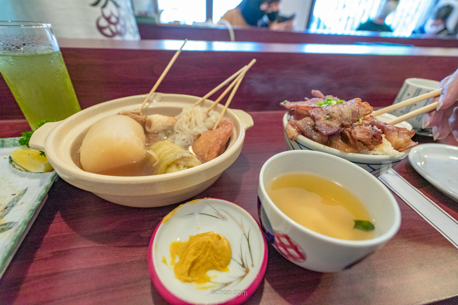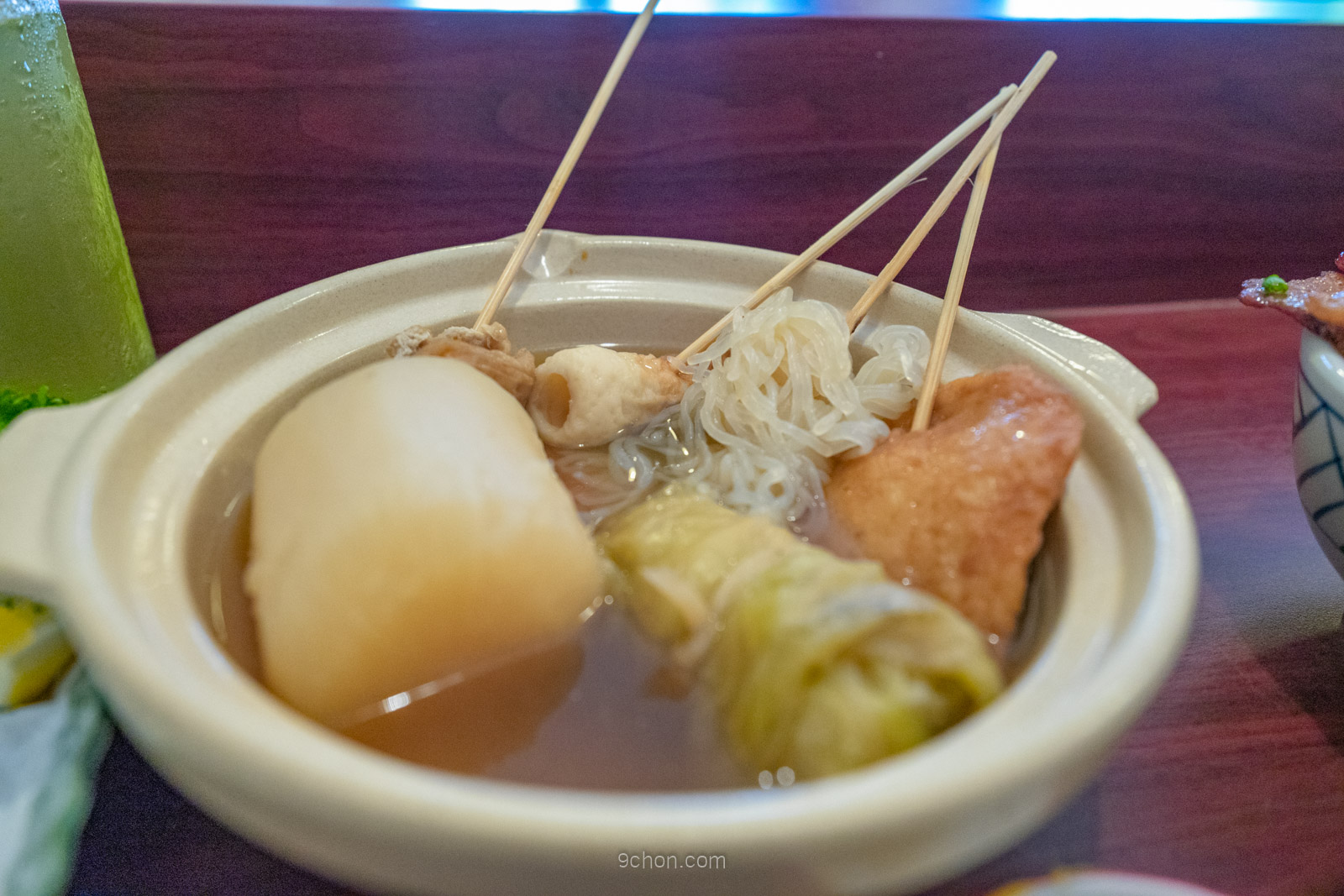 เซ็ตอุด้งรวม 6 อย่าง ทางร้าน Ameya ร้านโอเด้ง บางแสน แจ้งว่าแต่ละวันจะไม่เหมือนกัน เมนูของวันนี้ มีหัวไชเท้า ที่โคตรใหญ่ยักษ์ ใหญ่เท่ากำปั้น ไม่มีหั่นแยกชิ้น คำเดียวยัดไม่เข้า ไอ้เราก็คนไทยชอบกินแบบพอดีคำ แต่สไตล์ญี่ปุ่นคงชอบแบบนี้ กินคำใหญ่ๆ กะหล่ำปลีพันหมูสับคล้ายๆ ของไทย เส้นบุก ปลาแผ่น ชิคูวะ ฟองเต้าหู้ กลิ่นน้ำซุป กลิ่มรมควันปลาย่างติดจมูก ทำให้ดึงรสชาติหวานอร่อยของผักออกมา น้ำซุปต้มมาอย่างดี หวานผักรุนแรงมาก ส่วนตัวเป็นคนทานรสจัด ก๊วยเตี๋ยวต้องปรุง น้ำซุปที่นี่ ไม่ต้องปรุงก็ทานอร่อย ทางร้านมีคาราชิ มัสตาร์ดสีเหลืองของญี่ปุ่น ที่ให้รสเผ็ดฉุนคล้ายวาซาบิ เซิร์ฟคู่กันมา ถ้าใครอยากได้ความเผ็ดฉุนๆ ทางร้านแนะนำให้ผสมลงในน้ำซุป เราก็ทดลองตามคำแนะนำ ก็ได้ความอร่อยอีกแบบ เป็นรสชาติแปลกที่อร่อย แต่แค่ไม่ชิน